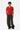Crafted from an Italian knit linen with a visible, slightly sheer texture in a red orange colorway, this t-shirt features a fitted silhouette. The design incorporates a one-piece body and sleeves for a seamless feel, finished with a collarless neckline. The short vertical opening at the front is fastened with four copper-black ball buttons that secure directly into thread loops. All seams, including the neckline, hem, and sleeve hems, are finished with a zigzag stitch.
